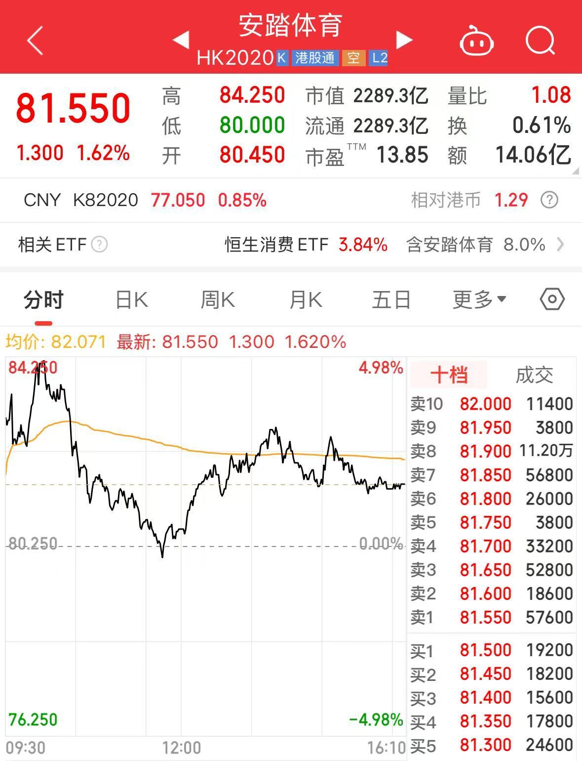 截至4月10日收盘,安踏体育股价上涨1.62%至81.55港元,市值为2289亿港元。