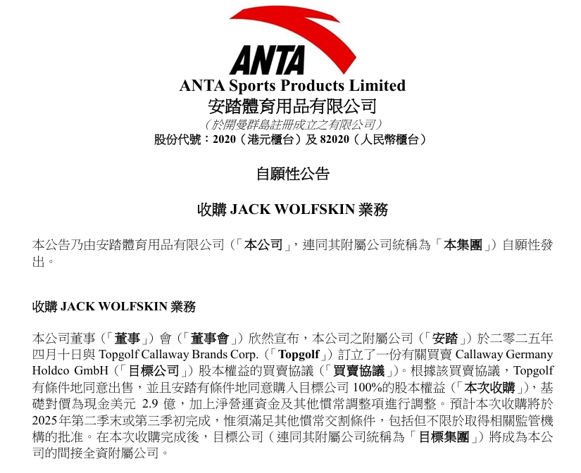 公告称,附属公司(安踏)与Topgolf Callaway Brands Corp.(Topgolf)订立了一份有关买卖Callaway Germany Holdco GmbH(目标公司)股本权益的买卖协议。根据协议,Topgolf有条件地同意出售,并且安踏有条件地同意购入目标公司100%的股本权益,基础对价为现金2.9亿美元(约合人民币21亿元),加上净营运资金及其他惯常调整项进行调整。预计本次收购将于2025年第二季末或第三季初完成。收购完成后,目标公司将成为公司的间接全资附属公司。目标公司于德国伊德斯坦因注册成立并在全球范围内的目标市场经营户外服饰、鞋履及装备品牌Jack Wolfskin(狼爪)业务。