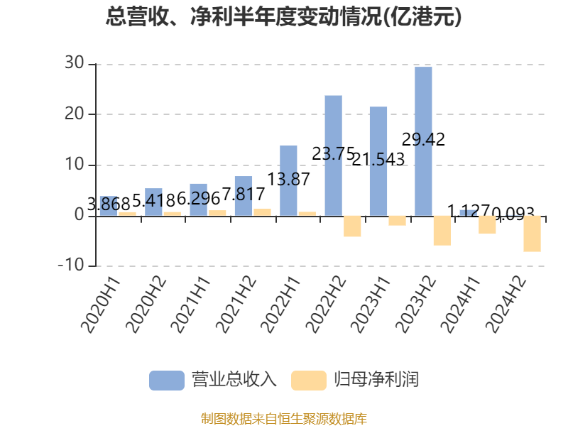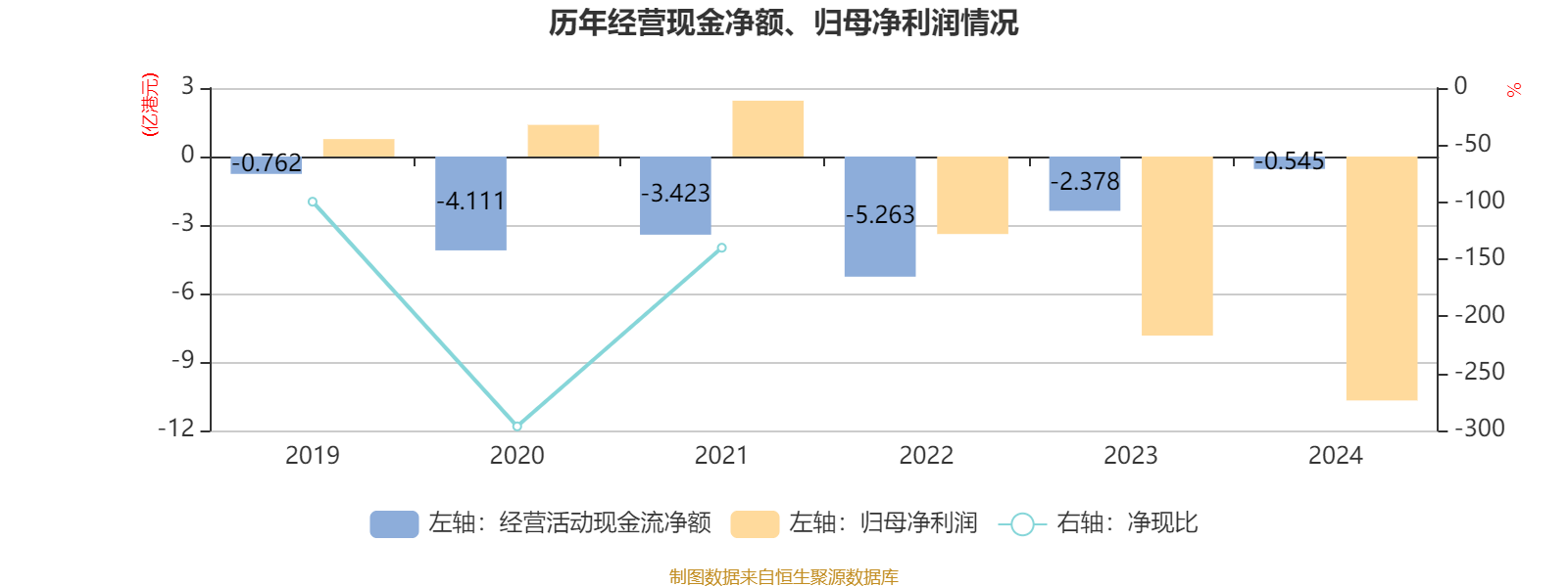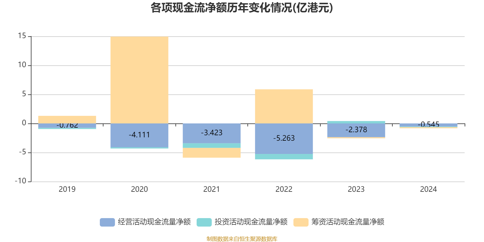 2024年,公司经营活动现金流净额为-5453.8万港元,同比增加1.83亿港元;筹资活动现金流净额-1845.6万港元,同比减少39.9万港元;投资活动现金流净额-1046.4万港元,上年同期为4103.4万港元。