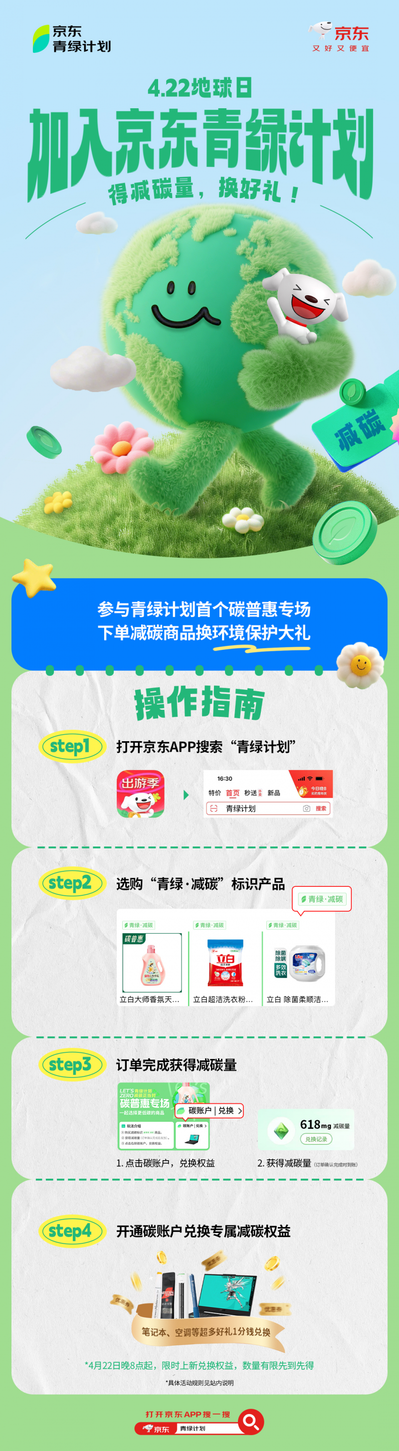 今年4月22日是第56个世界地球日,京东通过“青绿计划”开启首个碳普惠专场活动,联合立白、晨光、雀巢咖啡、华硕、美的、罗技等品牌,将消费者的每一次绿色订单转化为守护地球能源的关键力量。