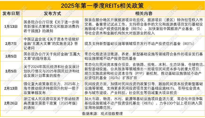 观点指数 2025年一季度,REITs市场在政策持续支持和市场结构优化的双重驱动下,展现出稳中向好的发展态势。底层资产类型持续扩容,融资与流动性表现双优,行业逐步迈入提质增效的新阶段。