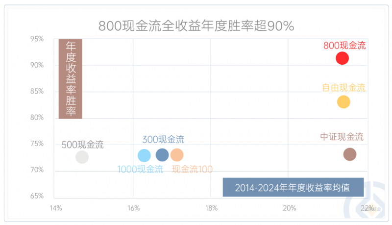 纵向从中短周期和长周期维度来看,截至2024年末,800现金流全收益指数自2019年以来,连续6个年度的收益均为正。拉长时间,自基日以来的11个完整年度中,仅2018年下跌,历史年度胜率超90%。