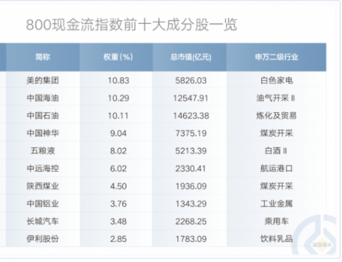 从位居前列的成分股来看,包含美的集团、中国海油、中国石油、中国神华、五粮液等,前五大重仓股合计占比48.27%,前十大占比约69.52%。此外,成分股中的央、国企成分占比达58%。