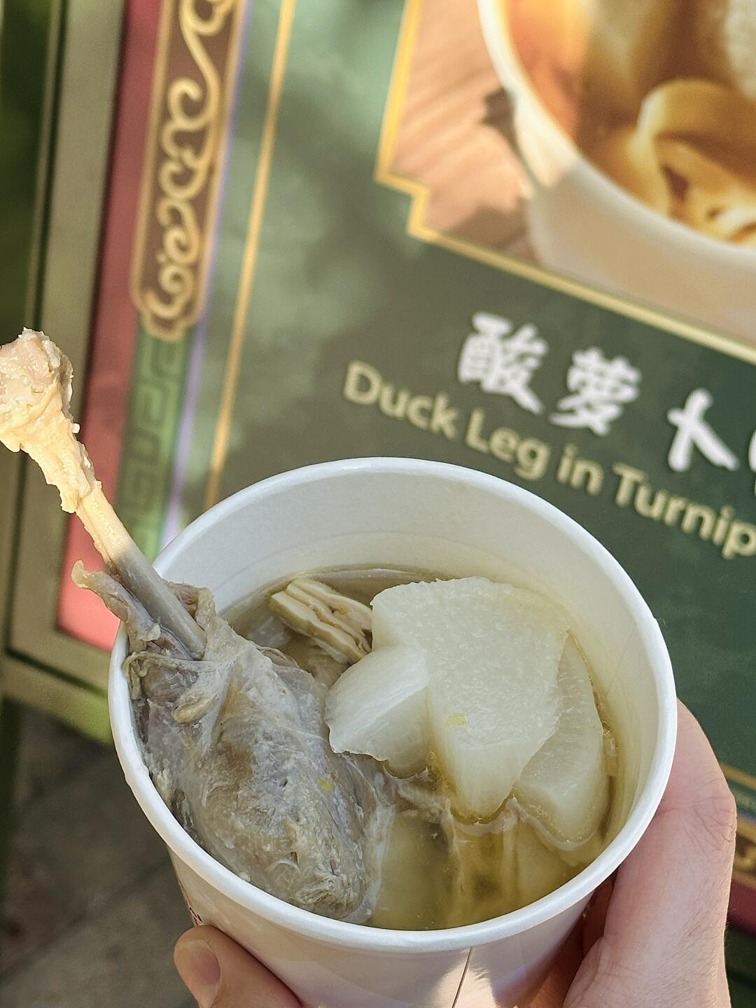 而最近在迪士尼园区,还流行起了省钱的穷鬼套餐。最火的就是酸萝卜鸭腿:一只鸭腿、几块萝卜和几片笋片卖到68元。看到价格,大家都表示,这也不便宜啊,这鸭腿难道是从唐老鸭身上拔下来的?