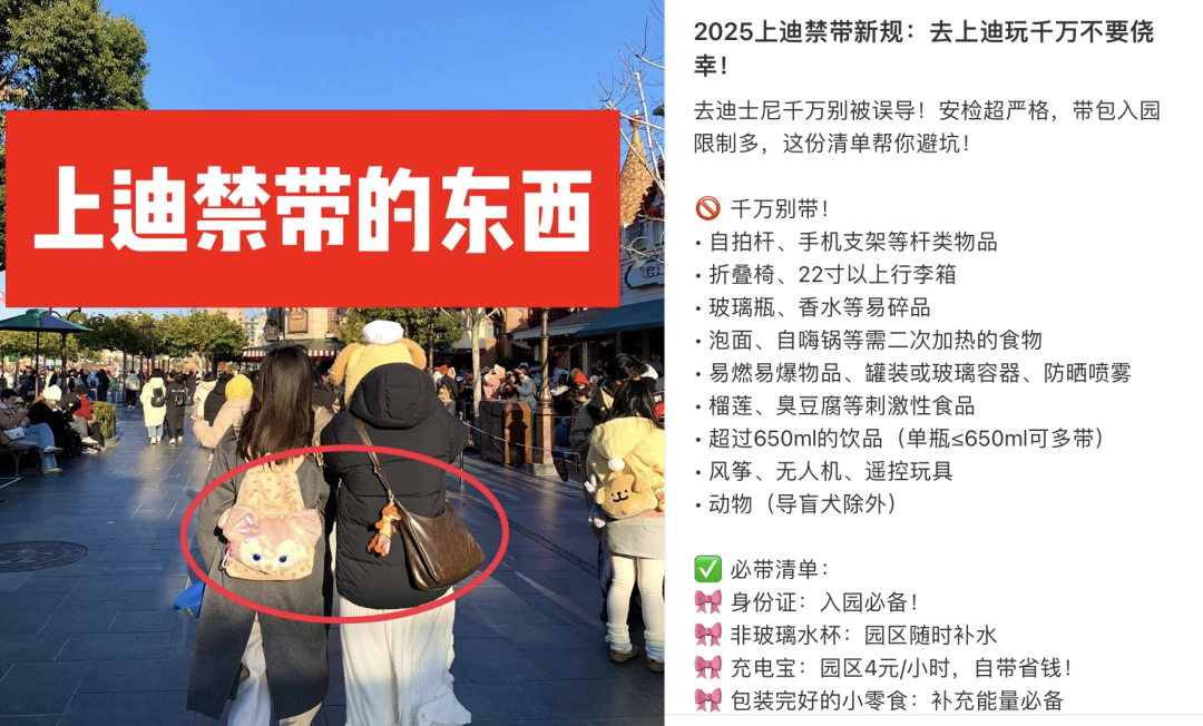 2019年曾有游客将上海迪士尼乐园告上法庭,原因是上迪禁止游客带食物入园,她胜诉后上海迪士尼取消了禁止游客携带食品入园的格式条款,不过仍对部分携带的物品/食物作出了限制。