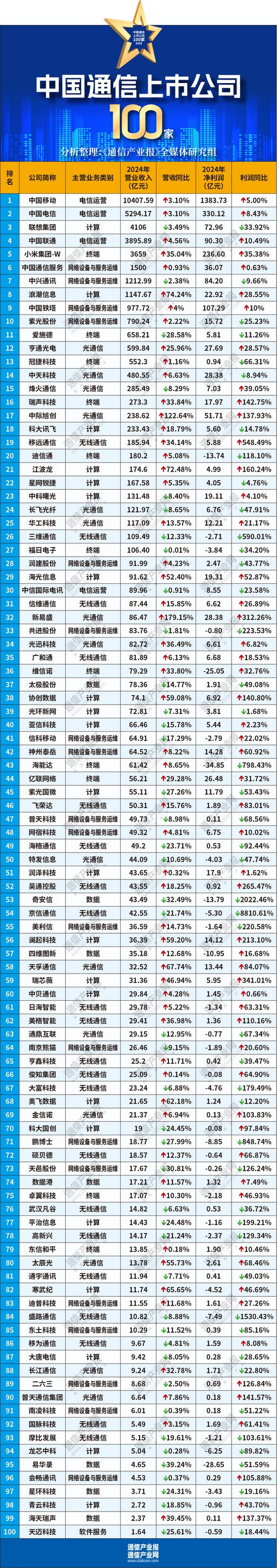 【通信产业网讯】(记者 崔亮亮)公司是通信业市场主体,更是产业中更具稳定性、更具感知度的主要力量,其业绩表现更直接反映行业景气度。随着通信企业2024年财报纷纷发布,通信业2024年整体业绩情况浮出水面。《通信产业报》全媒体监测的第九届“中国通信上市公司100家业绩”出炉,为研判通信业发展现实情况和趋势变化提供微观样本。