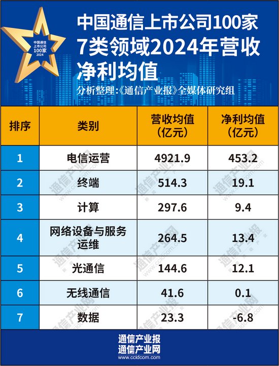 百家企业7大类别中,电信运营类企业营收净利最高,营收均值为4921.9亿元,同比提升3%;净利均值为453.2亿元,同比提升5.7%。