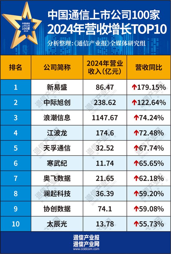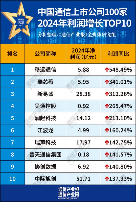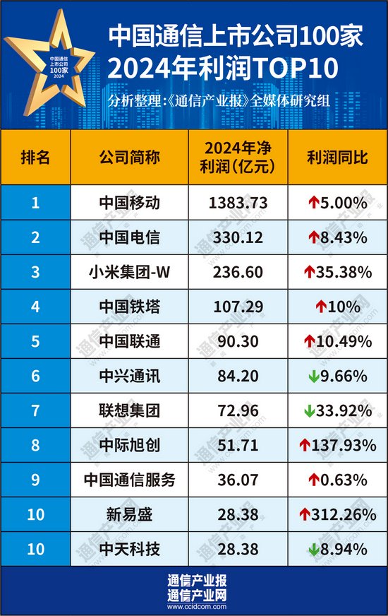 中国铁塔净利润从上年第五位上升为第四位,净利增长10%。中国铁塔两翼业收入提升较快,其中智联业务2024年营收89.11亿元,同比增长22.4%;中国联通净利润从上年第七位上升至第五位,净利增长10.49%,净利润连续第八年双位数增长;联想集团净利从上年第四位下降为第七位,营收降幅为33.92%;中际旭创从上年十一位上升为第八位,净利增长达137.93%;中天科技从第九位下降为第十位,净利下降8.94%;紫光国微从上年净利第十位,下降为二十四位,净利润下降达53.43%。