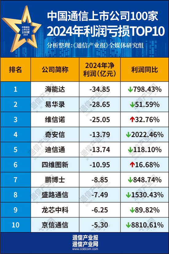 由盈转亏企业为8家,分别为奇安信亏损13.79亿元、盛路通信亏损7.49亿元、京信通信亏损5.3亿元、三维通信亏损2.71亿元、美利信亏损1.64亿元、共进股份亏损0.8亿元、通鼎互联亏损0.77亿元、天邑股份亏损0.26亿元。其中,京信通信、奇安信和盛路通信利润同比降幅最大,分别为-8810.61%、-2022.46%和-1530.43%。