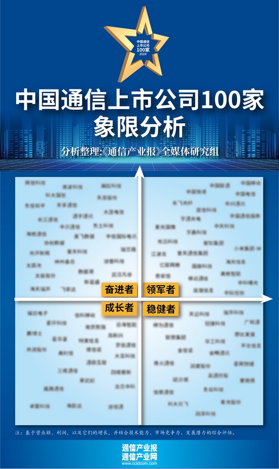 2024年,AI带动通信产业变革,算力网、大模型、数据要素、低空经济等新质生产力迅速发展,促进相关企业研发力量与资源重构,新一轮技术需求驱动通信业向新增长。本届《中国通信上市公司100家业绩》根据企业营收、净利及增长情况,并结合技术能力、市场竞争力、发展潜力等综合因素推出“中国通信上市公司100家象限图”(专题另发),整理体现企业发展情况。