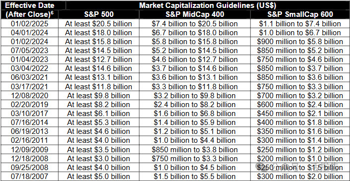 标普500指数纳入门槛:至少205亿美元市值