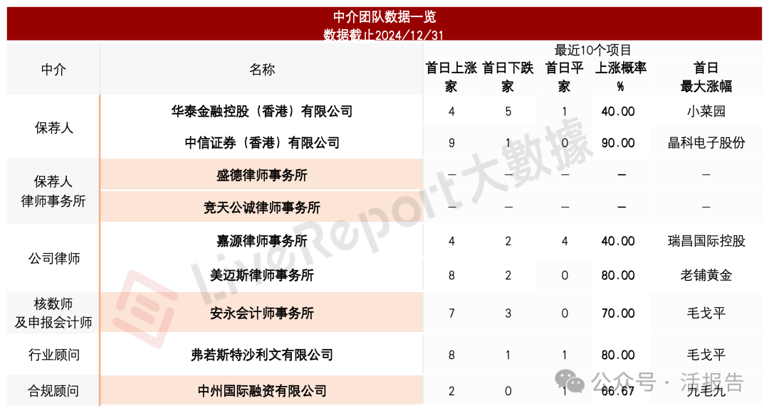 据LiveReport大数据统计,中信证券、华泰国际保荐项目首日破发率分别为25%、38.46%。