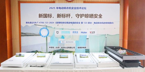 会上展示了7款首批通过GB/T 4706.123-2024《家用和类似用途电器的安全 第123部分:电动晾衣机的特殊要求》新国标技术要求的产品;同时也是获得2025年CHCT “电动晾衣机安全”认证的优势产品。获证产品分别是:米家牌智能晾衣机、HOTATA好太太牌智能晾衣机、邦先生牌电动晾衣架、Haier海尔牌智能电动晾衣机、公牛牌智能晾衣机。