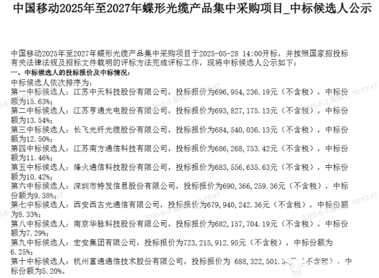 虽然规模有所下降,不过本次集采仍然吸引了十家头部光纤企业前来参与竞标。据中国移动5月30日公示的中标候选人名单,本次采购中标候选人包括: