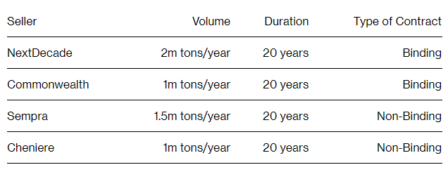 首席执行官Yukio Kani在接受采访时表示,这份为期20年的协议包括与NextDecade(NEXT.US)和Commonweath LNG LLC的采购合同,同时与桑普拉能源(SRE.US)及Cheniere(LNG.US)签署了合作意向书。