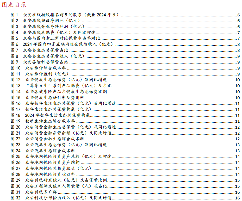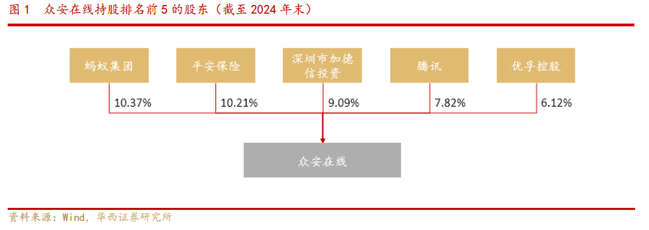 “三驾马车”全力支持众安发展。截至2024年12月31日,蚂蚁科技、中国平安、深圳市加德信投资、腾讯、优孚控股为公司前5大股东,分别持股10.37%、10.21%、9.09%、7.82%、6.12%,合计占比43.61%。蚂蚁作为公司第一大股东,与公司业务发展最为密切,公司健康生态的百万医疗险在其支付宝平台销售,生活消费生态的退货运费险主要源于淘宝和天猫平台;公司第二大股东中国平安则以共保的模式与众安一同向用户提供车险产品,按50%和50%的比例分摊车险业务相关保费、赔付及其他成本;公司的另一股东腾讯提供了销售产品的平台——微保。