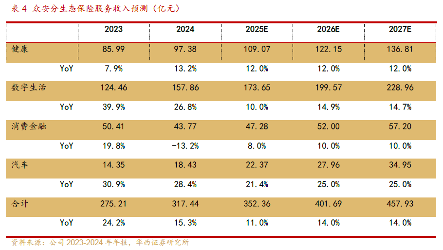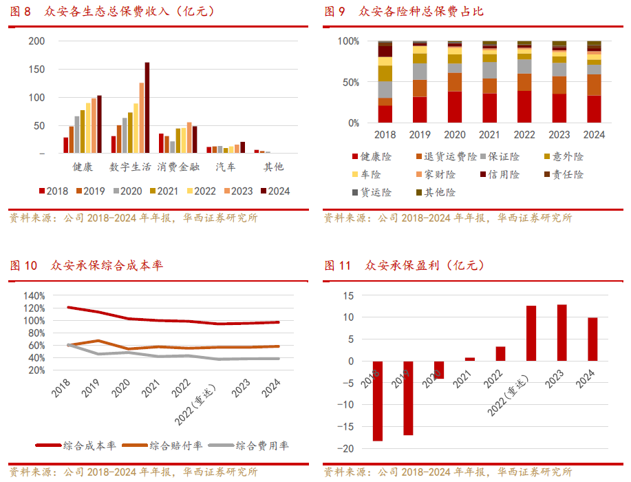 专注家用车领域,综合成本率整体较优。公司车险专注于家用车等高质量业务,2024年家用车车险总保费贡献比例达众安车险总保费的93.7%。2024年公司车险生态综合承保量为94.2%,同比-1.2pp;其中综合赔付率同比+2.4pp至67.5%,主要受用户出行增加的影响;综合费用率同比-3.6pp至26.7%,主要受益于精细化营运管理的提升以及报行合一的费用管控。