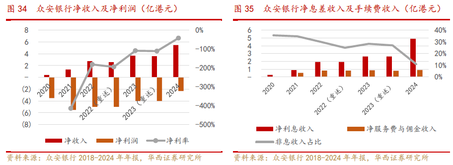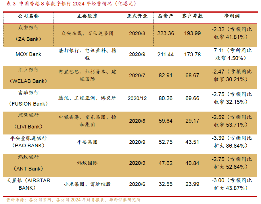 作为中国香港首家开业的数字银行,ZA Bank业务规模位居市场首位,2024年亏损同比大幅收窄。截至目前,中国香港金管局陆续发出3批共8张虚拟银行(2024年更名为“数字银行”)牌照,分别为LIVI BANK、众安银行、MOX BANK、汇立银行、蚂蚁银行、平安壹账通银行、天星银行和富融银行。2020年8家数字银行陆续开业。在资产和客户存款规模上,ZA Bank均领先中国香港其他数字银行。2024年客户存款同比+66%至194亿港元,总资产同比+60%至223亿港元,主要归功于创新存款产品的带动。在收入和利润方面,2024年,ZA Bank净收入同比+52.6%至5.48亿港元,在收入大幅增长的同时严控成本和风险,净亏损大幅收窄42%至2.32亿港币,全年亏损为8家中国香港数字银行中最小。