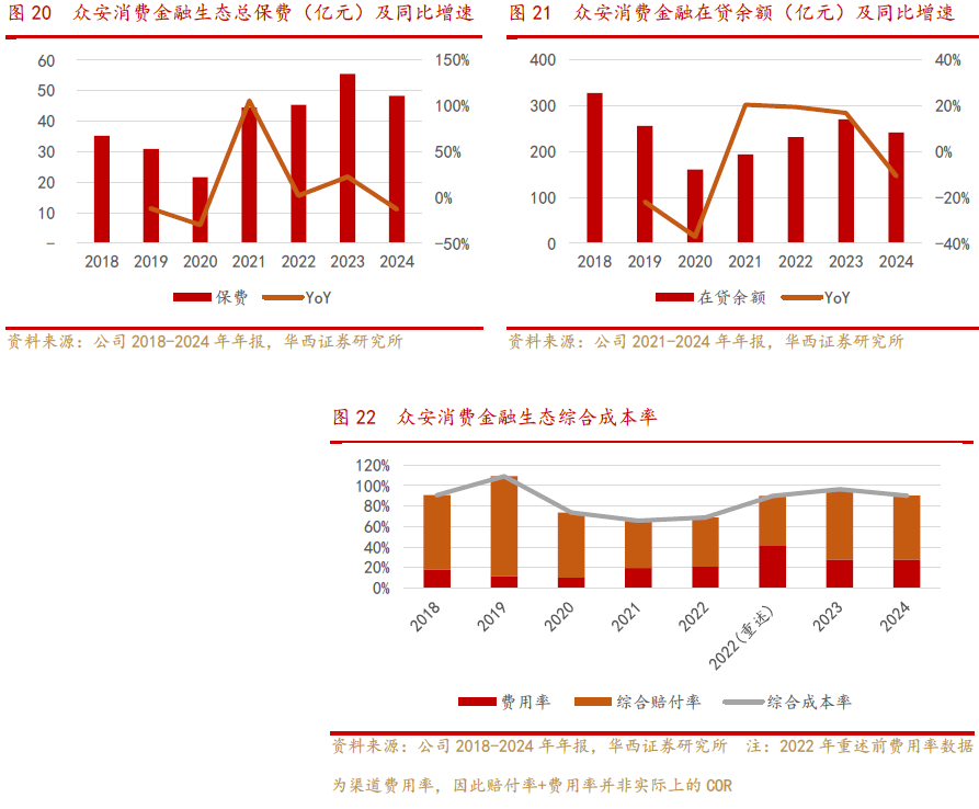 坚持审慎的经营策略,综合成本率大幅改善。面对不确定的宏观环境压力和行业挑战,公司主动收缩业务规模以应对资产质量波动。2024年公司消费金融生态总保费48.32亿元,同比-12.9%。截至2024年末,公司在消费金融生态所承保的在贷余额为241.99亿元,同比-10.7%。受益于宏观外部环境回暖,以及风控措施的收紧,2024年公司消费金融生态的综合成本率为90.1%,同比-6.3pp,其中综合赔付率为62.1%,同比-6.3pp;综合费用率28.0%,同比持平。