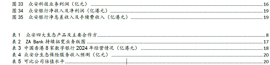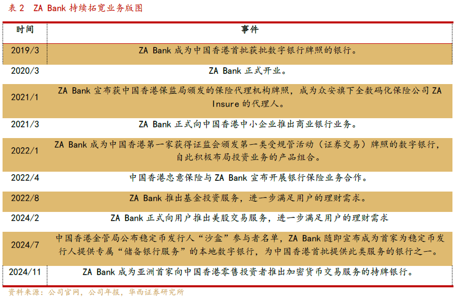 ZA Bank积极扩张业务版图,致力于打造一站式数字金融服务平台。2019年3月,ZA Bank成为中国香港首批获批数字银行牌照的银行,并于2020年3月正式开业。此后ZA Bank持续扩张业务版图,2021年1月获中国香港保监局颁发的保险代理机构牌照,成为众安旗下全数码化保险公司ZA Insure的代理人;2021年3月正式向中国香港中小企业推出公司银行业务;2022年1月成为中国香港首家获证监会颁发证券交易牌照的数字银行;2022年4月宣布与中国香港忠意保险开展银保合作;2022年8月推出基金投资服务;2024年2月宣布成为中国香港首家为稳定币发行人提供专属“储备银行服务”的本地数字银行;2024年11月成为亚洲首家向中国香港零售投资者推出加密货币交易服务的持牌银行。目前,ZA Bank已成为中国香港市场功能及产品最丰富的数字银行之一,通过手机端全数字化的运营模式打造一站式综合数字金融服务平台,为用户提供存贷款、转账、卡消费、外汇、保险代销、公司银行、基金投资、美股交易、加密货币交易和创新存款等产品及服务。