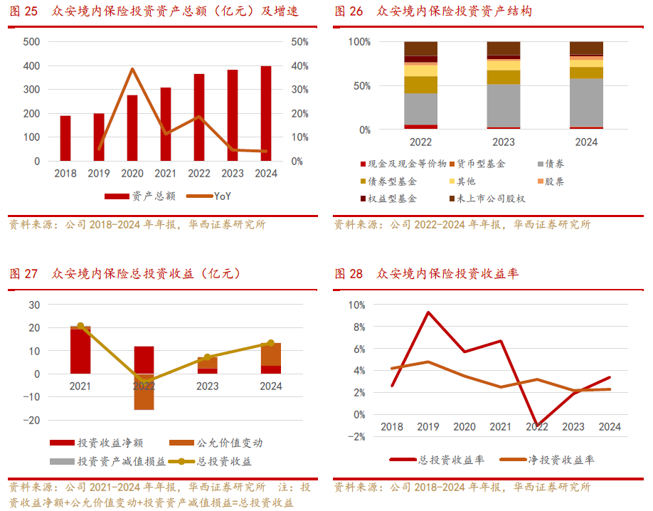 投资资产规模稳步扩张,投资风格稳健。截至2024年末,公司境内保险投资资产总额为397.76亿元,同比+4.1%。其中,现金及现金等价物、货币型基金、债券、债券型基金、股票、权益型基金、未上市公司股权(主要包括公司全资子公司众安科技和众安保险经纪的股权)占比分别为2.7%(同比持平)、0.8%(同比+0.5pp)、54.2%(同比+5.9pp)、13.4%(同比-3.0pp)、4.3%(同比+1.9pp)、1.7%(同比-2.6pp)、14.6%(同比-0.7pp),增配债券减配权益,整体投资风格稳健。