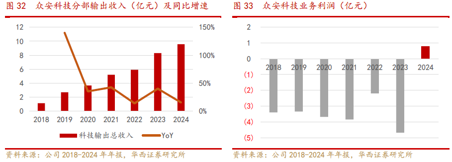 科技输出收入高速增长,利润2024年首次扭亏。收入方面,众安科技输出业务收入由2018年的1.12亿元持续提升至2024年的9.56亿元,年复合增速高达43.0%,其中2024年同比增长15.3%,主要受益于国内及全球金融行业持续数字化转型趋势。利润方面,2024年科技分部净利润为7,761万元,首次扭亏为盈,主要由公司科技输出业务逐步成熟,研发投入减少,同时收入实现高增所驱动。