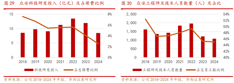 众安在线持续布局人工智能、云计算、大数据等前沿技术板块,旨在通过科技重塑保险价值链各个环节,解决保险业务流程中的痛点,为用户提供优质服务和便利体验,同时大幅提升公司经营效率,更好地实现规模效应,并优化营销效率。众安一直重视科技研发投入,2018-2024年公司研发投入累计达72.44亿元,占公司总保费的4.8%。截至2024年末,公司的工程师及技术人员共计1,077名,占公司员工总数的45.0%;专利申请量累计达463件。