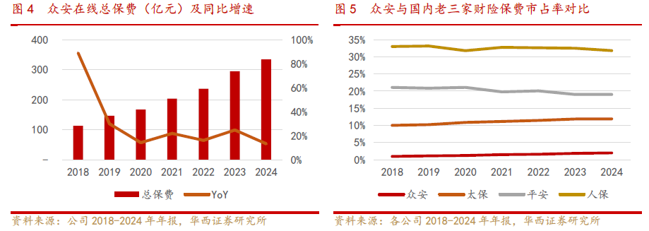 国内互联网财险龙头,保费维持双位数增长。2018-2024年,众安总保费收入由112.56亿元增长至334.17亿元(CAGR=19.9%),保持高增。2025年前4月,众安保费收入(按原保费口径)达109.35亿元,同比增长12.7%,实现了高于国内财险行业的整体增速(4.1%)。据公司2024年财报披露,按总保费计,众安保险在国内财险行业的排名提升1名至第8名(2024年在国内财险行业市占率为2.0%),且在国内互联网财险市场份额排名第一。