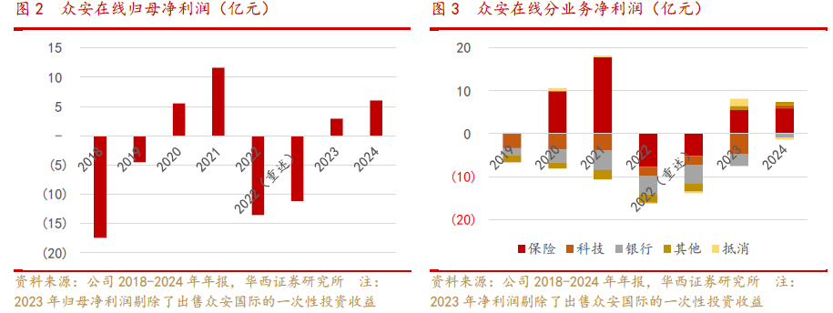 业绩波动较大,保险主业贡献主要利润。公司主要业务分部包括:1)保险分部提供各类互联网财险业务;2)科技分部提供信息技术输出相关业务;3)银行分部在中国香港提供数字银行服务;4)其他分部包括前三大分部之外的实体,在中国香港提供线上寿险(ZA Life)、保险经纪、医疗服务等。公司于2020年实现上市以来首次盈利;2021年受益于承保业务扭亏为盈及投资收益大幅增长,归母净利润同比高增;2022年受资本市场表现疲软叠加切换IFRS 9会计准则,投资收益大幅减少及汇兑损失拖累,归母净利润下滑至亏损;2023年投资收益改善驱动归母净利润扭亏为盈;2024年归母净利润达6.03亿,可比口径下同比+105.4%(可比口径剔除了2023 年出售众安国际的一次性收益影响),主要归功于保险业务利润提升、科技业务扭亏为盈和银行业务净亏损大幅收窄。分业务板块来看,2024年保险板块分部净利润为5.88亿元,同比+6.2%,主要受益于资本市场回暖影响;科技分部扭亏为盈,净利润同比提升5.46亿元至0.78亿元,受益于国内及海外金融行业持续数字化转型;银行分部亏损收窄,净亏损减少1.92亿元至0.92亿元。