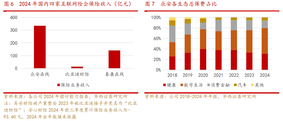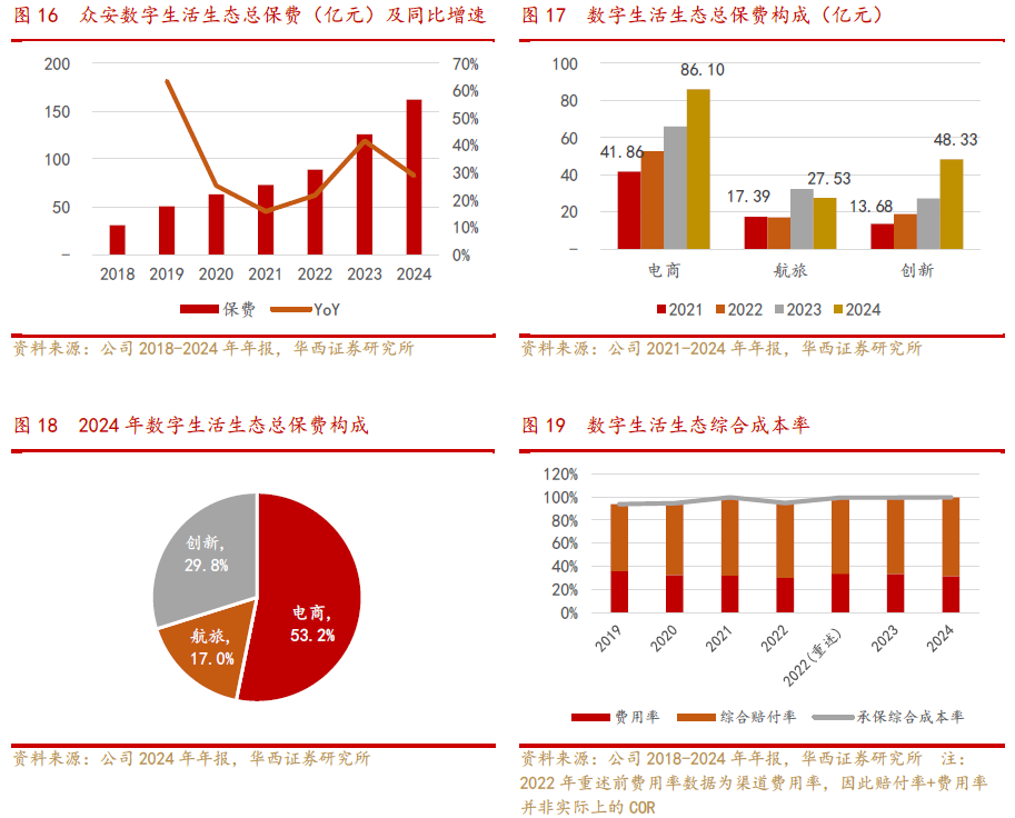 受益于电商行业高景气及创新业务蓬勃发展,众安数字生活保费保持高增。数字生活生态是公司利用自身在科技和数据分析方面,就数字生活场景定制保障服务,业务分为电商、航旅出行、创新业务三大板块。1)在电商领域,公司为电商平台提供涵盖退货、产品品质、物流、售后服务、商家履约金等场景的电商类保险产品。2)在航旅出行领域,公司通过国内所有主要OTA渠道提供航班意外、航班延误、履行意外、机票或酒店取消的航旅类保险产品,并进一步推出出境旅游保险产品。3)创新业务方面,公司紧跟新消费的发展趋势,持续利用科技赋能,并基于数据分析和使用者生活追踪,快速持续推出如宠物险、多场景意外险、手机碎屏险、无人机保险和家财险等创新产品,推动数字生活生态保费快速增长。2018-2024年,公司数字生活生态总保费从30.77亿元提升至161.97亿元(期间CAGR高达31.9%),2024年同比+28.9%。其中电商/航旅/创新业务2024年分别实现保费收入86.10/27.53/48.33亿元,分别同比+30.6%/-15.1%/+77.2%,分别在数字生活生态保费收入中占53.2%/17.0%/29.8%。航旅出行板块保费同比下降预计主要系公司主动压降部分费用率较高的业务。