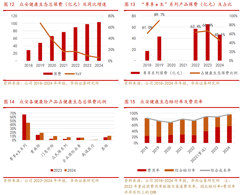 产品矩阵丰富,“尊享e生”系列为核心。围绕以“尊享e生”为核心的百万医疗险,公司构建了包括普惠、慢病、门急诊险、重疾、中高端医疗等丰富的产品矩阵服务用户的深层健康保障需求。其中,以“尊享e生”为代表的医疗险为公司的健康险旗舰产品,自推出以来10年经历了累计25次迭代,满足用户升级和个性化的健康需求。截至2024年,“尊享e生”系列产品总保费46.61亿元,占健康生态总保费比例为45.1%,较2019年显著降低。在普惠领域,公司众民保系列产品总保费7.68亿元,同比+177%,占健康生态总保费比例为7.4%;公司和滴滴平台推出车主保障计划方案、点滴保,已累计服务了超过300万名专车司机。在慢病领域,公司有超过100个专属产品,另外针对女性群体推出包括好孕保在内的35个专属产品。公司门急诊险/重疾险/高端医疗/企业团险业务2024年分别实现总保费10.58/19.62/1.08/6.37亿元,分别占健康生态总保费的10.2%/19.0%/1.0%/6.2%。