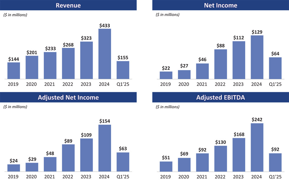 业绩方面,在过去的2022-2024年和2025财年前3个月,公司收入为2.68、3.23、4.33和1.55亿美元,同期调整后的EBITDA分别为1.3、1.68、2.42和0.92亿美元。