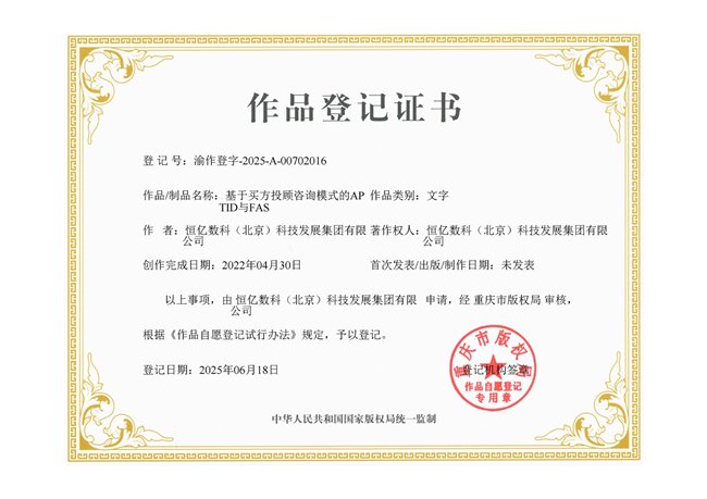 近日,恒亿数科(北京)科技发展集团有限公司在金融科技赛道实现重大突破,其精心研发的《基于买方投顾咨询模式的APTID与FAS》成功获得知识产权认证。