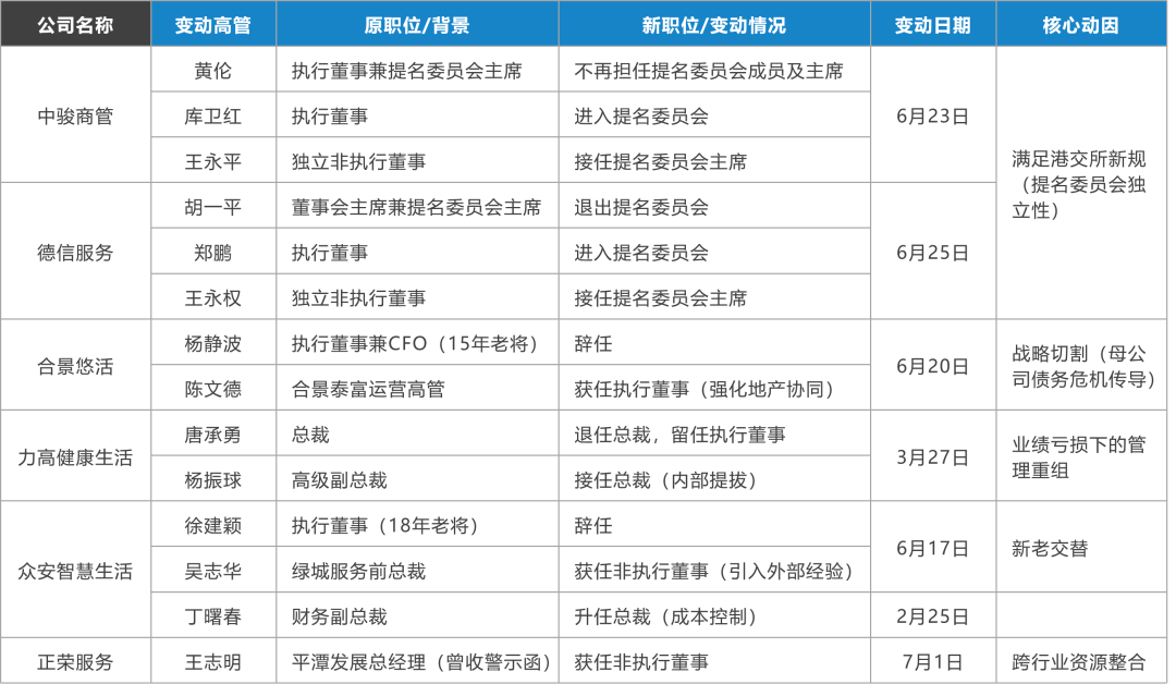 2)地产系重掌实权:合景悠活委任合景泰富老将陈文德为执行董事,其28年的地产经验被视为强化地产与物业协同的关键;力高健康生活总裁更迭为杨振球,延续内部提拔路径。