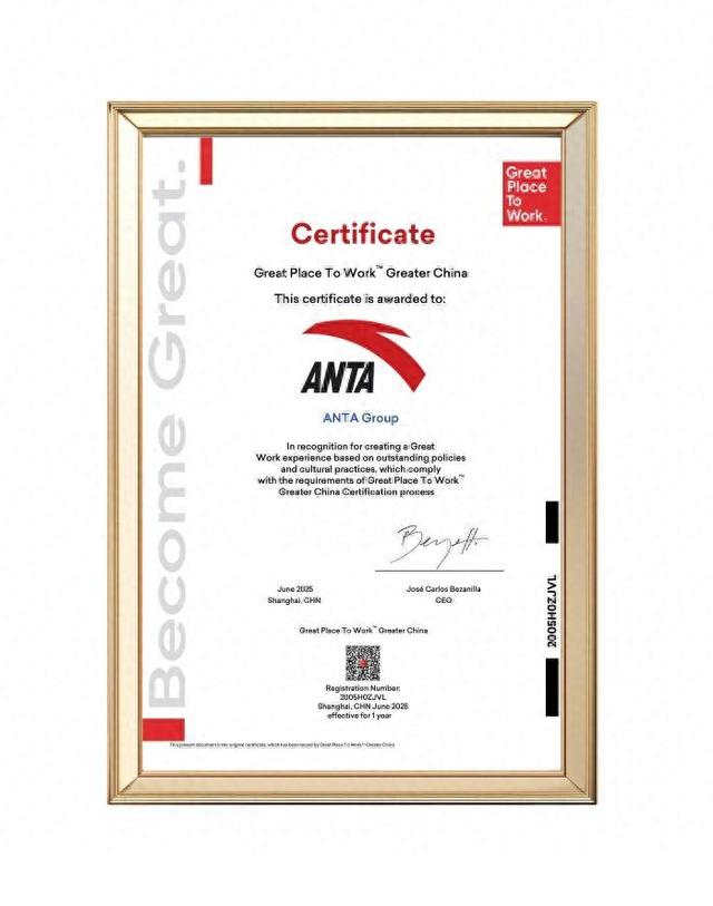 近日,安踏集团荣获全球权威职场文化评估机构——Great Place To Work®颁发的“卓越职场”认证。作为中国体育用品行业中首家获此殊荣的企业,安踏集团以89%的信任指数高分一次性通过认证,得分高于2024年340多家大中华区参评企业的平均水平,标志全球权威机构对其在企业文化建设与雇主品牌塑造方面的高度认可。