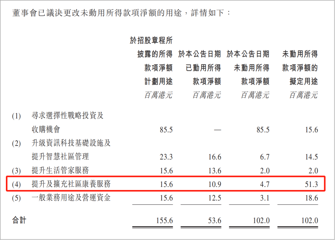 力高健康生活近期宣布对IPO募集资金用途进行重大调整,计划将未动用的1.02亿港元中的51.3%,约5230万港元,投入“社区康养服务”领域。