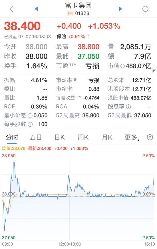 开市锣敲响之后,富卫以38港元开盘,与发行价齐平。虽然开盘后一度破发,不过最终收于38.4港元,微涨1.05%,保住了首日上市的颜面。