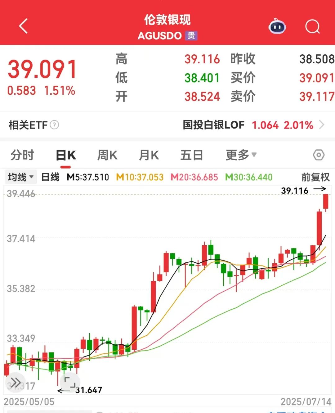 7月14日,伦敦银现货盘中站上39美元/盎司,续创2011年9月以来新高,年内涨幅超过35%,成为今年以来表现最好的大类资产,同期伦敦金现货累计上涨28.31%,白银现货跑赢黄金现货约6个百分点。国内期货方面,沪银主力合约年初至今上涨21.38%,最新报价9207元/千克,为该品种上市以来新高。