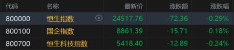 港股呈现高开低走行情,三大指数尾盘均转跌。截止收盘,恒生指数跌0.29%,国企指数、恒生科技指数分别下跌0.18%及0.24%,盘中三者均刷新4月以来新高。