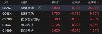 加密货币概念股走高,蓝港互动涨超25%,博雅互动涨超9%,国泰君安国际、雄岸科技、欧科云链跟涨。