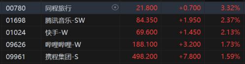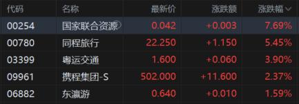 旅游概念股表现活跃,同程旅行涨超5%,粤运交通涨近4%,携程集团、东瀛游跟涨。