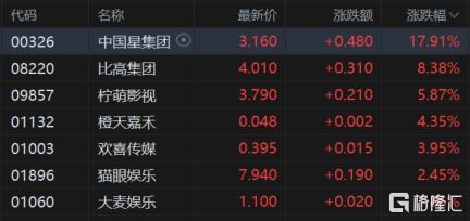 影视股涨幅居前,中国星集团涨超17%,比高集团涨超8%,柠萌影视涨超5%,欢喜传媒、猫眼娱乐等跟涨。