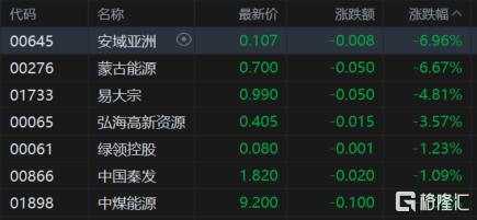 煤炭股大跌,安域亚洲、蒙古能源跌超6%,易大宗跌超4%,中国秦发、中煤能源等跟跌。