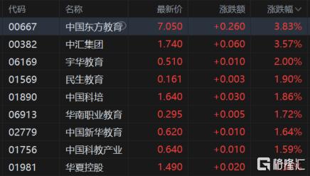 职业教育股普涨,中国东方教育、中汇集团涨超3%,宇华教育涨2%,民生教育、中国科培、华南职业教育等跟涨。