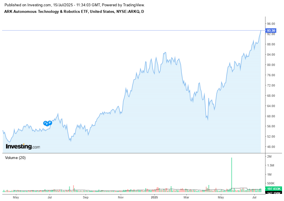 ARKQ的费率为0.75%。过去十年,回报率高达355%,近三年升幅达73%,分析师预期2025年还有15%上升空间。