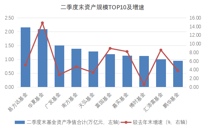 基金公司二季度非货管理规模延续增长态势,单季增长近1.29万亿元,总规模首次突破20万亿元。其中,华夏基金与易方达基金表现突出,分别以1206.75亿元、1025.11亿元的增量,成为二季度仅有的两家非货规模增长超千亿元的机构。