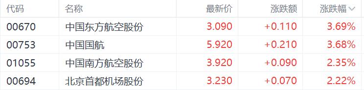 航空股部分活跃,中国东方航空股份、中国国航涨超3%,中国南方航空股份、北京首都机场股份涨超2%。