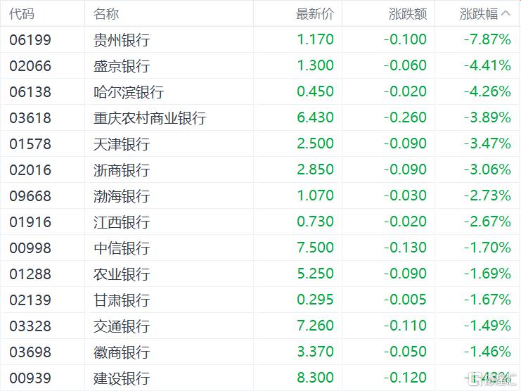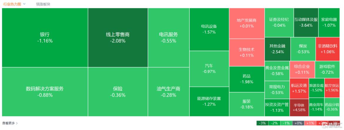 大金融板块飘绿,中金公司、中信证券、农业银行、建设银行、中国平安、友邦保险等跌幅超1%以上。