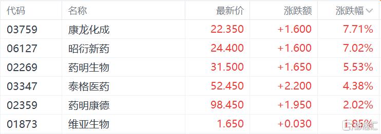 CRO板块走强,康龙化成、昭衍新药涨超7%,药明生物涨超5%,泰格医药涨超4%。