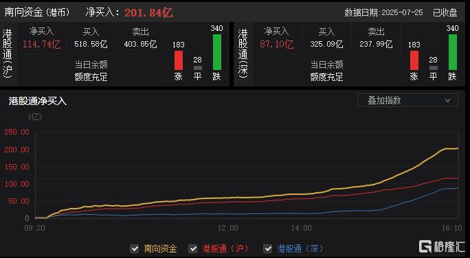 今日,南向资金净买入201.84亿港元,创今年4月22日以来单日净买入额新高。其中,港股通(沪)净买入114.74亿港元,港股通(深)净买入87.10亿港元。